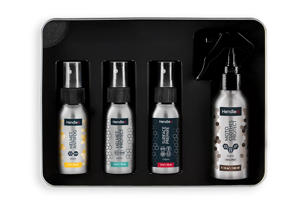 MOTO CARE SET – CLOTHES & HELMET PROTECTION A set of nano coatings designed to protect motorcycle gear and helmets. Easy and quick application resulting in long lasting protection. Protection from fogging, clothes looks much longer like a brand new, softens the leather clothes and enhance the colour of the surface.